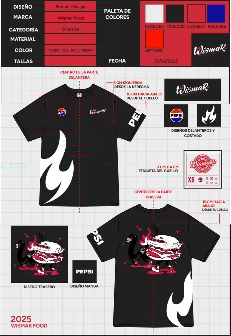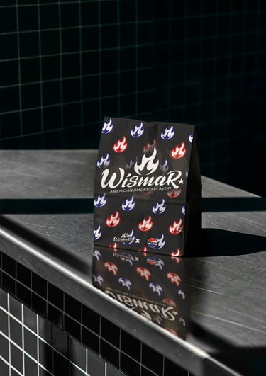 Estética streetwear: En lugar del típico diseño de comida rápida, creé un pattern con el isotipo de la llama de Wismar. Este recurso visual acerca el packaging al mundo de la moda urbana y el hype, elevando la percepción del producto que va dentro.